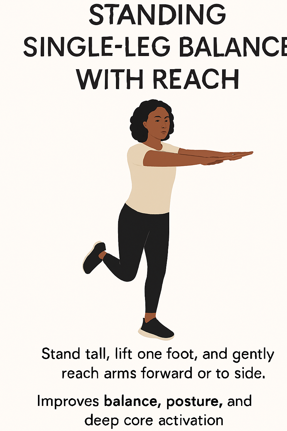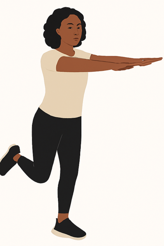 Stand tall, lift one foot, and gently reach arms forward or to the side.