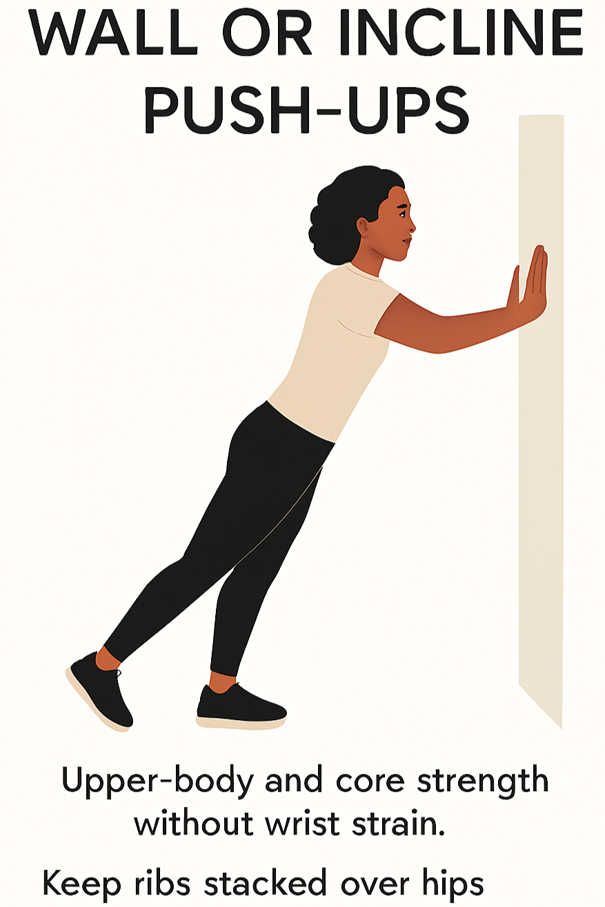 3. Wall or Incline Push-Ups – 8–12 reps